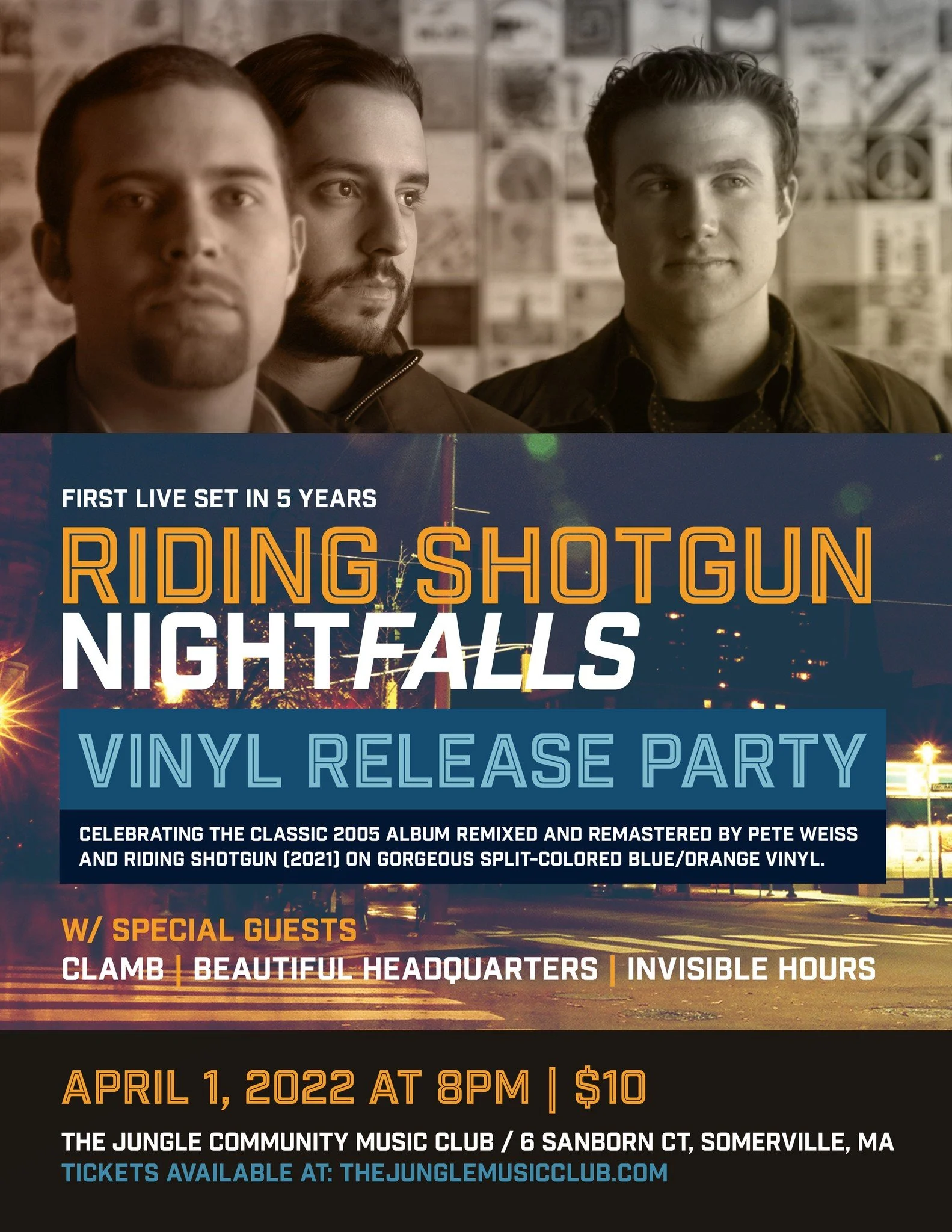 Riding Shotgun returns after a 5 year absence w/ the re-mastered, re-release of their classic 2005 album "NIGHTfalls" on limited edition colored vinyl! Joining them are psychedelic stalwarts Clamb, mashup masterminds Beautiful Headquarters and the atmospheric pummelers Invisible Hours!
